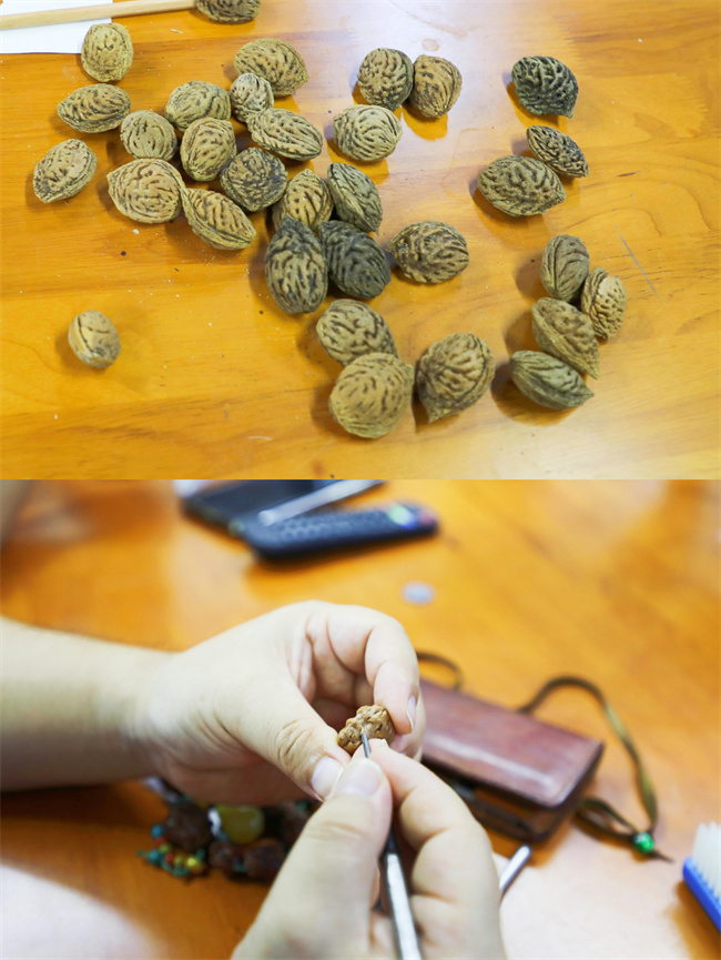 核藝堂學員正在雕刻桃核,桃核經雕琢變為方寸大小