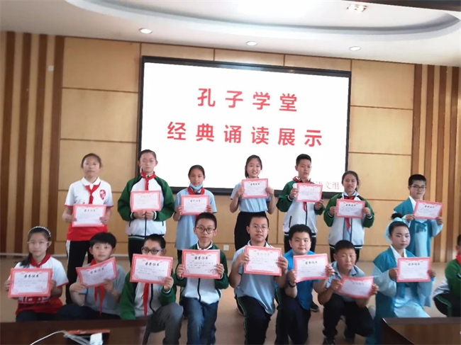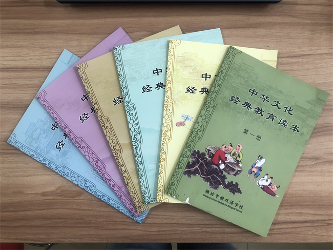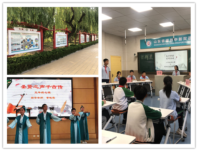 整齊響亮的誦讀聲從濰坊中新雙語學?!秱鹘y文化》展示課上傳出。40分鐘的時間,“國學小知識”“德育小故事”、“詩文小鏈接”、“傳統節日小檢測”四個部分將課堂填充得豐富而有趣。