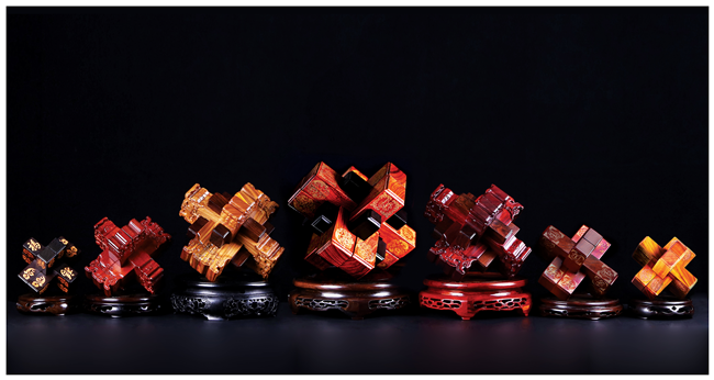 秉承著不斷創新的精神,李浩團隊在完成六根、九根結構的“魯班鎖”后,他們設計并成功制作出目前最為復雜的24根結構的“魯班鎖”。經過多年市場考驗和歷煉,如今已經設計開發了以魯班鎖為代表的8大類100余種“圣匠魯班”文化品牌系列工藝品,獲得國家專利近50項。