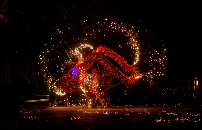夜里,在臺兒莊古城復興樓前,融合運河文化和魯南元素的國家非遺“火龍鋼花”都會震撼上演,人在龍中舞,龍在火中飛,怒放的火龍鋼花劃破夜空,演繹出現場的炫美磅礴與壯觀,引得游客陣陣叫好。