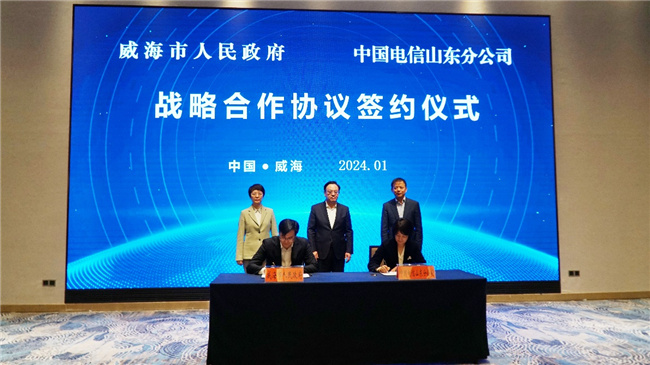 1月17日,中國電信山東分公司與威海市人民政府舉行戰略合作簽約儀式。中國電信山東分公司黨委書記、總經理文勇,黨委委員、副總經理王秀美,威海市委書記閆劍波,威海市委副書記、市長孔凡萍,威海市副市長張善東等領導出席。