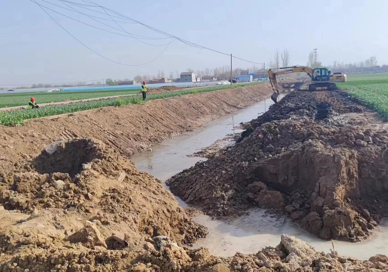 在疏挖修復溝渠現場,挖掘機和工作人員相互配合,通過架設橋梁,對過路涵洞的拓寬,重新埋設,以及對各主干溝渠內的淤泥、漂浮物、雜草等進行挖掘清理,徹底打通了各溝渠間“毛細血管”,確保排水暢通。