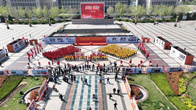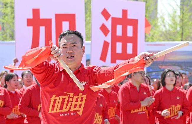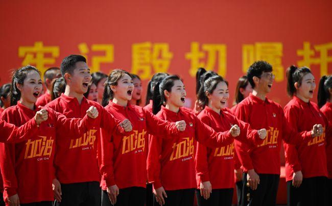 《踏著鐵人的腳步走》《咱們工人有力量》《擼起袖子加油干》《我們走在大路上》《新時代勝利之歌》《加油!勝利!》等7首耳熟能詳的歌聲響徹勝利廣場,紅色激情在每一個人心中激蕩。