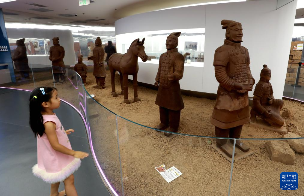 7月18日,小朋友在觀看用巧克力制作的“兵馬俑”。