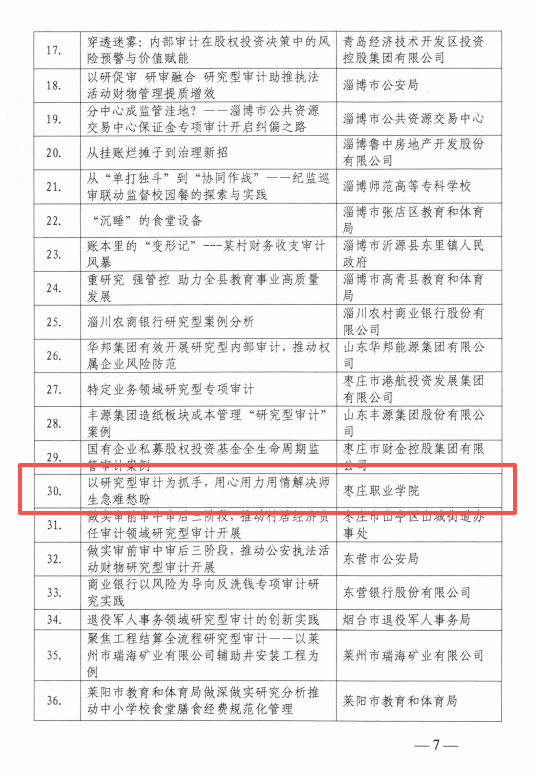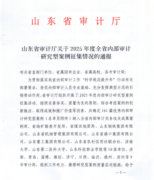 近日,山東省審計廳下發《關于2025年度全省內部審計研究型案例征集情況的通報》,學校報送的《以研究型審計為抓手,用心用力用情解決師生急難愁盼》審計案例,獲評2025年度全省優秀內部審計研究型案例,納入全省內部審計實務攻關成果案例庫。