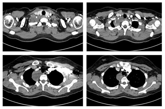 原發/累及胸廓出口部的腫瘤起源復雜,常見的有后縱隔神經源性腫瘤,肺源性腫瘤,胸膜纖維瘤及肉瘤等,其中神經源性腫瘤及肺源性腫瘤占絕大部分。成人常見的胸廓出口部巨大腫瘤多為良性神經源性腫瘤,對于中老年患者,多數為神經鞘瘤,而對于青年患者則神經纖維瘤相對多見?;颊叱o明顯癥狀,腫瘤較大時可出現相應組織結構受壓所致的癥狀,如腫瘤壓迫頸部交感神經所致的Horner綜合征等。而對于惡性腫瘤,如肺上溝瘤等,患者往往會在腫瘤外侵時出現上肢疼痛、肌力下降、胸背部不適等癥狀。