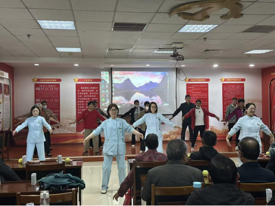 在腎病科亓東紅護士長與透析室王雪護士長的共同帶領下,腎友和醫護人員一起練習了傳統養生功法“八段錦”。伴隨著舒緩音樂,大家動作整齊、呼吸均勻,在動靜結合中感受傳統養生文化的魅力。不少腎友表示,這類溫和運動非常適宜,有助于改善身體狀態。