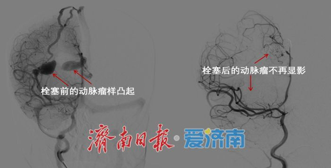 隨后,小明被緊急轉診至山東大學附屬兒童醫院神經外科。神經外科主任王廣宇帶領團隊立即為患兒開展進一步檢查,結果顯示小明腦內不僅有1處巨大血腫,還同時存在2處大型動脈瘤樣突起——這一復雜病情正是導致其顱內血腫的關鍵原因。