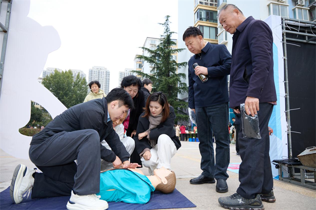 除了趣味游戲,現場還設置了急救技能體驗區。來自濟南市安培職業培訓的講師帶來心肺復蘇實操教學,吸引不少居民駐足學習?!芭袛嗷颊呤欠袷ヒ庾R,要輕拍雙肩并呼喊;進行胸外按壓時,手掌根部要放在胸骨中下段,按壓深度5-6厘米,頻率保持每分鐘100-120次……”講師一邊用模擬人演示,一邊拆解操作步驟,從開放氣道、清理口腔異物到人工呼吸的正確姿勢,每個細節都講解得清晰易懂。居民們紛紛上前嘗試,講師則一對一糾正動作,確保大家掌握規范操作?!耙郧爸辉陔娨暽弦娺^心肺復蘇,今天親手操作才知道要領這么多,學會了不僅能保護自己,說不定還能幫到別人!”參與體驗的社區居民小張感慨道。
