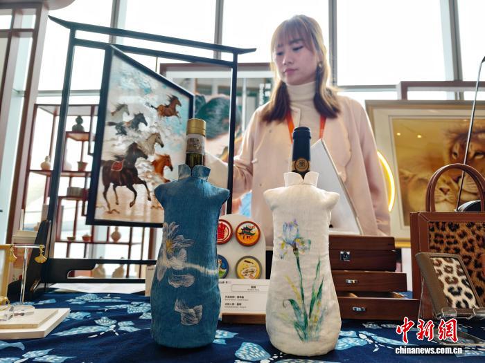 湘繡展區,各種湘繡文創產品吸引了法國友人的目光,大家爭相詢問湘繡制作技藝。從法國留學歸來的湘繡市級非遺代表性傳承人昌妮攜手長沙市望城區蠟染扎染非物質文化遺產代表性傳承人馮燦,特意為此次論壇制作了刺繡旗袍紅酒套。