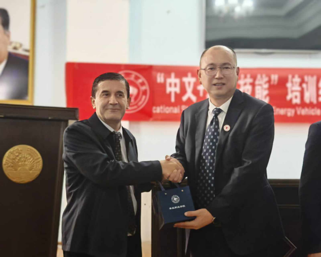 在塔吉克斯坦冶金學院總部,代表團與校長巴霍季爾?納比(Bakhtiyor Nabi)舉行正式會談,回顧前期合作框架協議落實情況,對“班?墨學院”未來發展進行戰略規劃并簽署合作備忘錄。雙方明確將依托智能制造、新能源汽車、農業等專業優勢,在師生互訪、課程開發、學術研究、技術培訓等方面開展實質性合作,共同打造中塔職業教育合作典范平臺。會談后,代表團出席了“中文+職業技能”培訓結業儀式及“塔吉克斯坦冶金學院-班?墨學院”揭牌儀式。