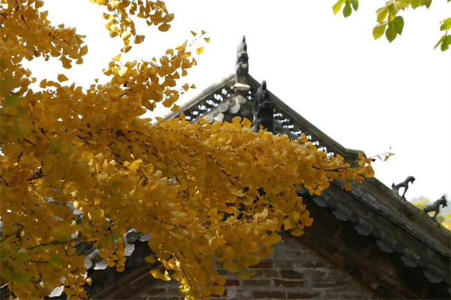 金黃銀杏枝椏與古建飛檐相映,織就一幅絕美畫卷。辛崇志/攝