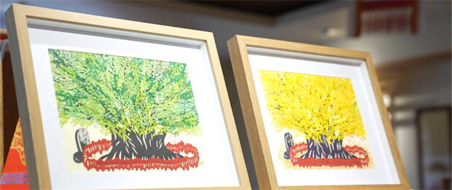 文創店工作人員于福星分享道:“我們這關于銀杏的主要文創有冰箱貼、書簽、手賬本等。其中最具有特色也是最受歡迎的就是這一幅銀杏樹的剪紙作品。它融入了非遺的刀刻技法,每一組葉片都是純手工刻制的。并且渲染出了不同層次的豐富的黃色,將古樹的生命力與豐富的色彩躍然紙上,栩栩如生。我們也希望通過非遺讓更多的人了解到銀杏樹,了解到我們這里,喜歡這里?!?/p>