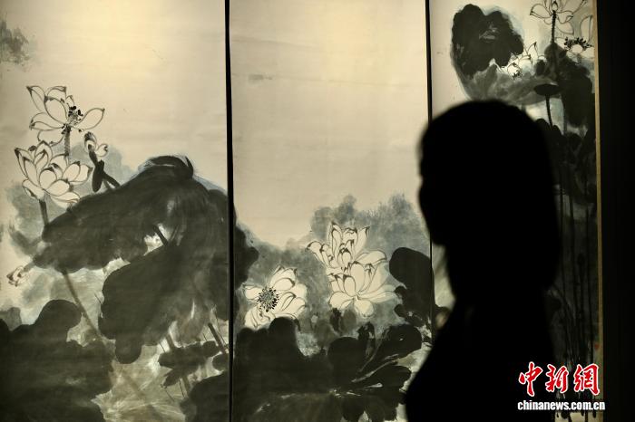 2024年9月13日,香港蘇富比于中環置地遮打的蘇富比旗艦藝廊展出張大千潑墨鉅制《巨荷》六連屏畫作。圖為張大千巨幅潑墨畫作《巨荷》。中新社記者李志華攝