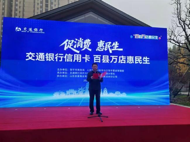 11月8日,由鄒平市商務局、人民銀行濱州市分行鄒平營業管理部主辦,交通銀行濱州分行、鄒平市黃山街道辦事處承辦,山東圣豪商業有限公司、銀聯商務濱州分公司協辦的“促消費惠民生——交通銀行信用卡百縣萬店惠民生”活動在鄒平市悠樂里商圈正式啟動。此次活動旨在通過政銀企三方合力,進一步釋放消費潛力、激發市場活力,為鄒平市經濟高質量發展注入金融動能。