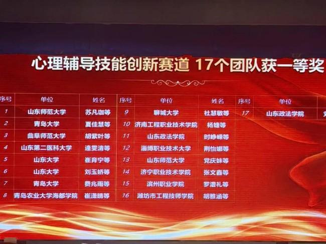 本賽事是由山東省科學技術協會、山東省教育廳、共青團山東省委、山東省發展和改革委員會、山東省工業和信息化廳、山東省人力資源和社會保障廳聯合主辦的第十七屆山東省大學生科技節賽事活動之一,是山東省心理學專業領域一項重大賽事。今年大賽設心理輔導技能創新、心理教育教學創新、應用心理案例開發、心理科普影視創作、人工智能心理場景設計五個賽道,初賽接收到省內外近140所院校的2704項參賽作品,參賽選手13000余人。經過專家委員會的嚴格評審,大賽共產生一等獎82項,二等獎157項,三等獎571項。本次大賽是山東省內心理學類專業影響范圍最廣、參賽人數最多的賽事。