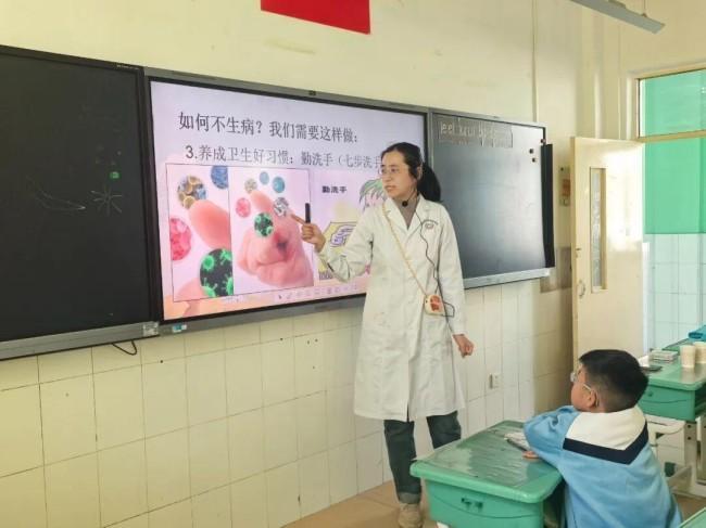 針對一年級學生認知特點,賈燕燕創新采用兒歌傳唱、漫畫卡通展示等寓教于樂的形式,將抽象的醫學知識變得生動有趣。她用通俗易懂的語言向孩子們講解人體“防御系統”的奧秘,細致科普疾病成因、常見癥狀及檢測常識。在實踐環節,賈燕燕將人體免疫系統比作“身體防御軍隊”,提出了保證充足睡眠、規范佩戴口罩、堅持七步洗手法等具體防護措施,并帶領孩子們現場演練“七步洗手法”,逐步驟示范動作要領,確保每個孩子都能掌握這一重要技能。