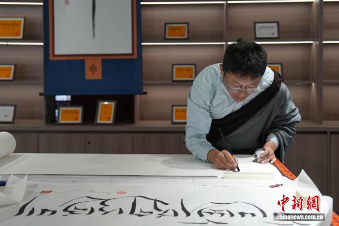 圖為西藏鄉村振興產品展示中心內的藏文書法體驗區。貢確攝